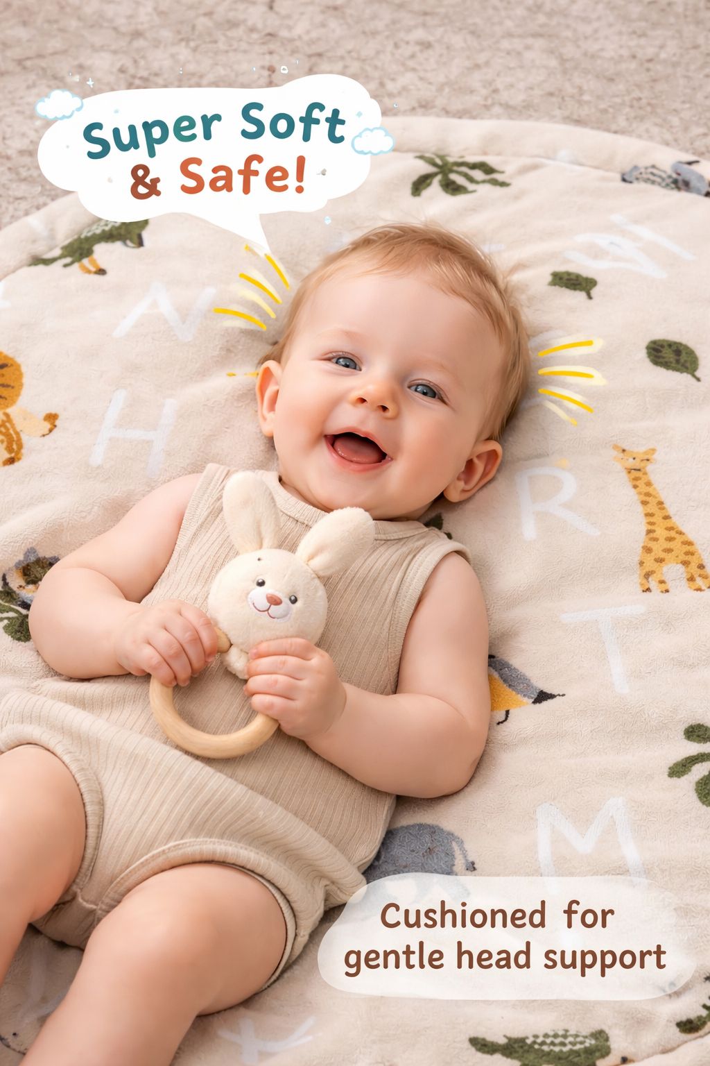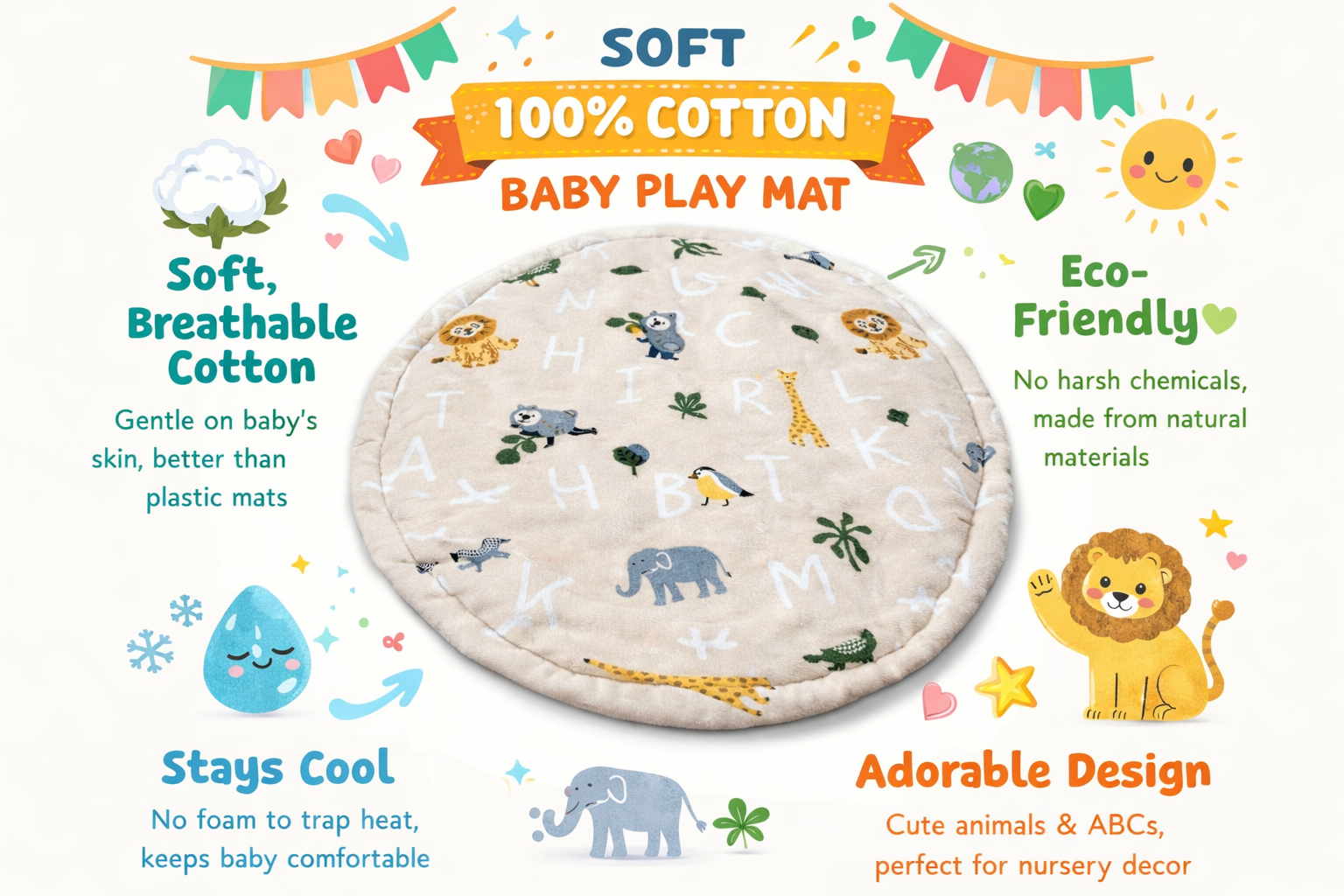 100% Cotton Baby Play Mat – Soft Round Infant Floor Mat with Animal & Alphabet Design | Eco-Friendly, Breathable, Non-Toxic Playmat for Tummy Time, Crawling & Nursery Decor